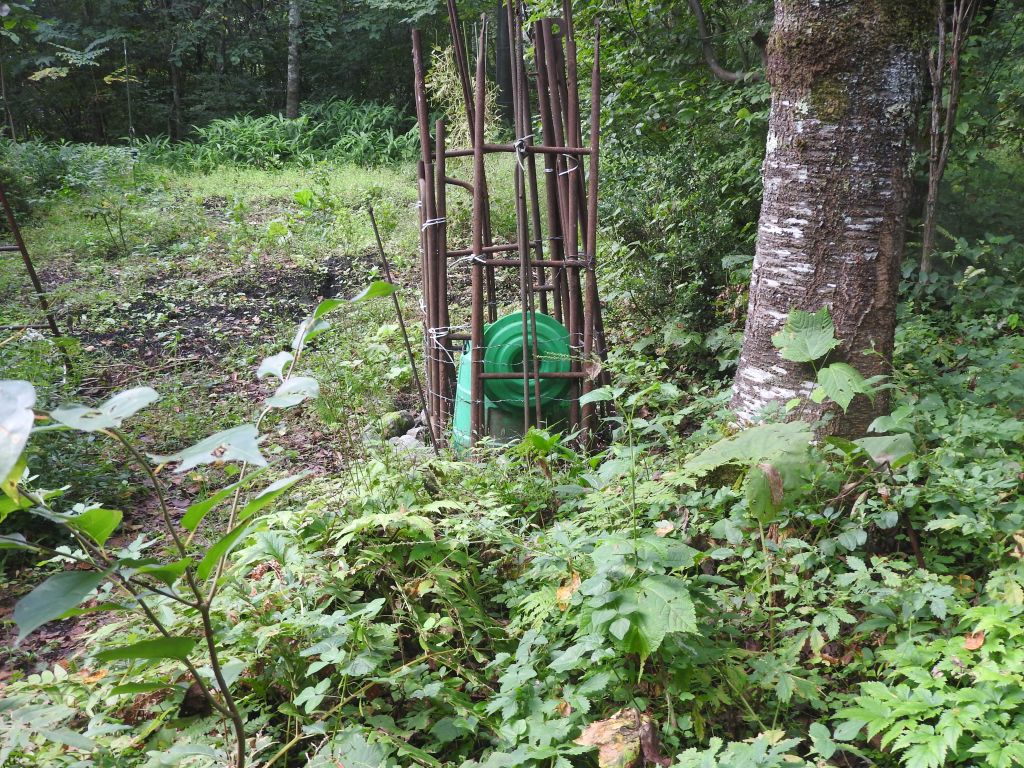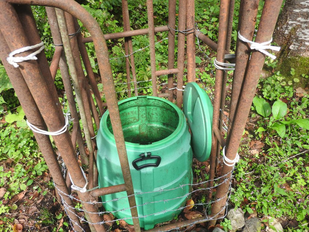 コンポストは更に鉄棒を周りに縛り付け、これでもかと補強し、最後に入り口も塞ぎ、カメラをセットしました。10月の獣の姿を監視します。誰が徘徊しているか楽しみです。