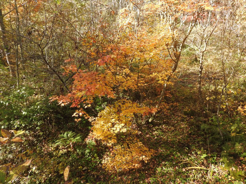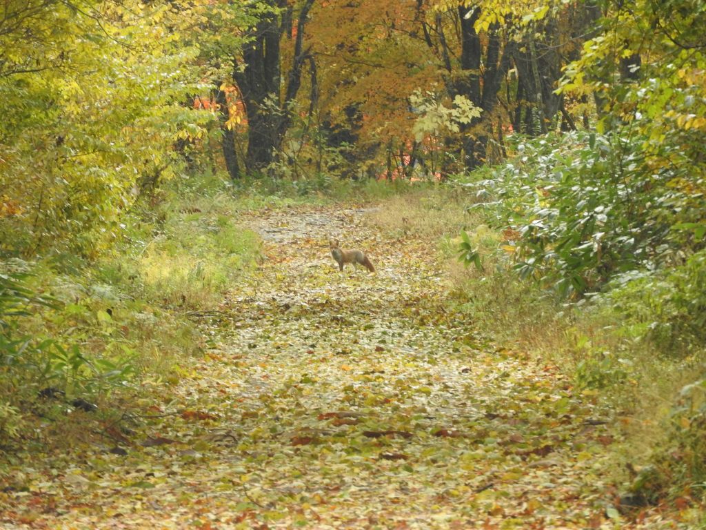 林道に暖かな日差しを受けてキツネがのんびりとこちらを伺っています。穏やかな感じですが、世間を騒がす熊は苦労なく人間界の食べ物の味を覚えてしまい、楽で贅沢になってしまい人間に接触するようになったのでしょう。