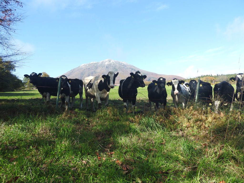 久しぶりの牧場に牛が十数頭、人懐っこく我々の姿を見ると寄って来ます。戸隠、黒姫、妙高と雪を被り、いよいよ雪が下りて冬が迫って来るでしょう。